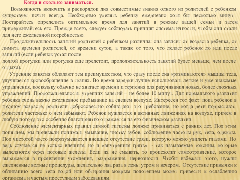 Возможность включить в распорядок дня совместимые знания одного из родителей с ребенком существует почти всегда. Необходимо уделять ребенку ежедневно хотя бы несколько минут. Постарайтесь определить оптимальное время для занятий в режиме вашей семьи и затем придерживайтесь его. Прежде всего, следует соблюдать принцип систематичности, чтобы они стали для него ежедневной потребностью.