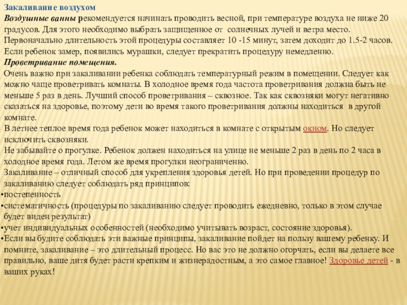 20 градусов. Для этого необходимо выбрать защищенное от солнечных лучей и ветра место. Первоначально длительность этой процедуры составляет 10 -15 минут, затем доходит до 1.5-2 часов. Если ребенок замер, появились мурашки, следует прекратить процедуру немедленно.