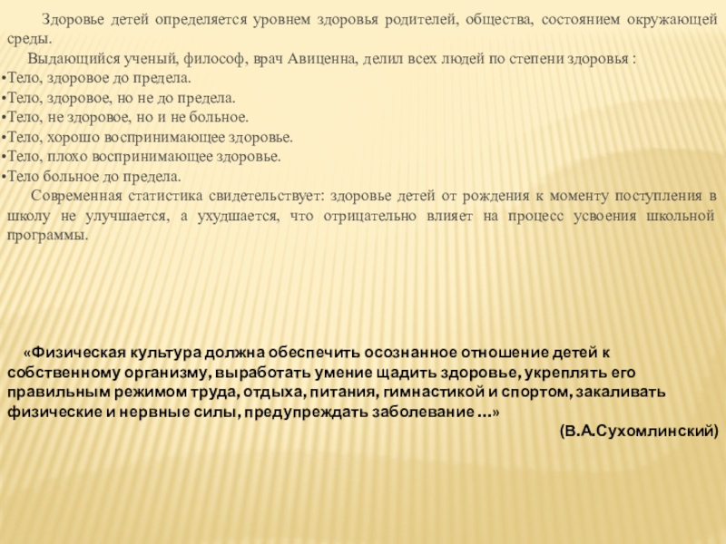 «Физическая культура должна обеспечить осознанное отношение детей к собственному организму, выработать умение щадить здоровье, укреплять его правильным режимом труда, отдыха, питания, гимнастикой и спортом, закаливать физические и нервные силы, предупреждать заболевание …»