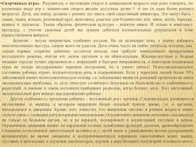 говорить, но различные виды игр с элементами спорта вполне доступны детям 5 -6 лет (и даже более раннего возраста). Дети, как пищу, должны с ранних лет иметь свой спортивный инвентарь. Это могут быть - санки, лыжи, коньки, резиновый круг, велосипед, ракетки для бадминтона или мячи, кегли, городки, шашки и шахматы. Таким образом, физическая культура – понятие емкое. И только в комплексе процедур, с учетом здоровья детей мы сумеем добиться положительных результатов в этом первостепенном вопросе.