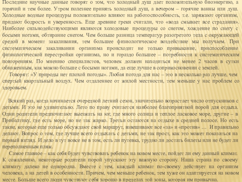 – постоянно влияют на закаливание организма, а система терморегуляции у нас включается при жаре или холоде. Закаливание нужно рассматривать как естественное (влияние природных факторов на человека в повседневной жизни) и специально организованное, с выполнением обязательных условий.