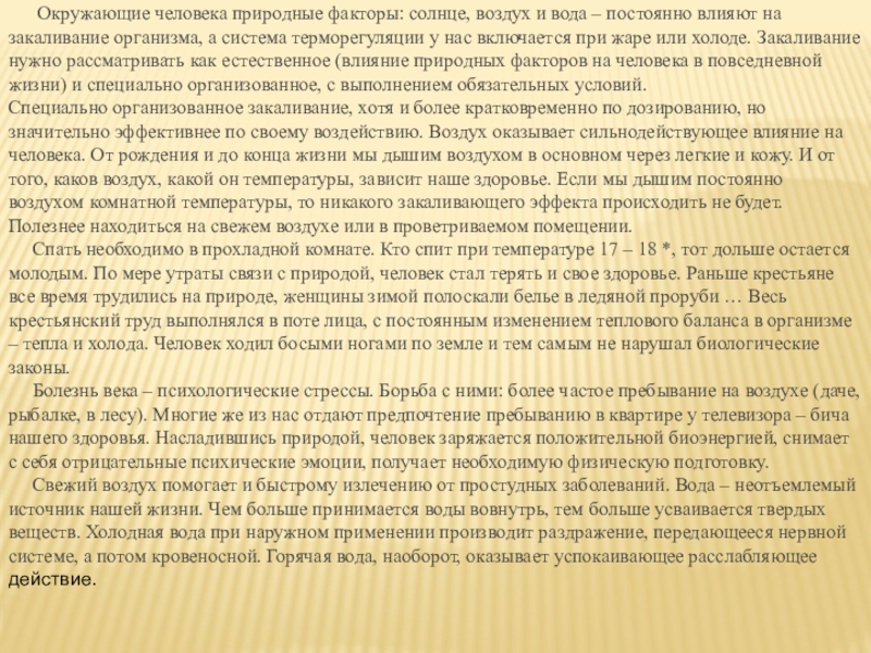 Свежий воздух помогает и быстрому излечению от простудных заболеваний. Вода – неотъемлемый источник нашей жизни. Чем больше принимается воды вовнутрь, тем больше усваивается твердых веществ. Холодная вода при наружном применении производит раздражение, передающееся нервной системе, а потом кровеносной. Горячая вода, наоборот, оказывает успокаивающее расслабляющее действие.