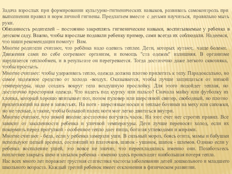 Главной причиной большинства простудных заболеваний у детей является несоответствие одежды и обуви ребенка температурному режиму. Значит, необходимо всегда сопоставлять температуру воздуха и одежду ребенка, не допуская как перегревания, так и переохлаждения тела.