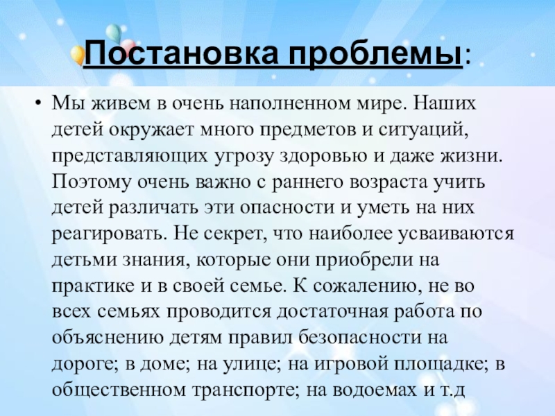 много предметов и ситуаций, представляющих угрозу здоровью и даже жизни. Поэтому очень важно с раннего возраста учить детей различать эти опасности и уметь на них реагировать. Не секрет, что наиболее усваиваются детьми знания, которые они приобрели на практике и в своей семье. К сожалению, не во всех семьях проводится достаточная работа по объяснению детям правил безопасности на дороге; в доме; на улице; на игровой площадке; в общественном транспорте; на водоемах и т.д