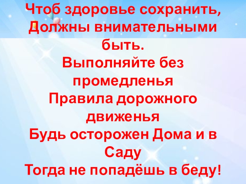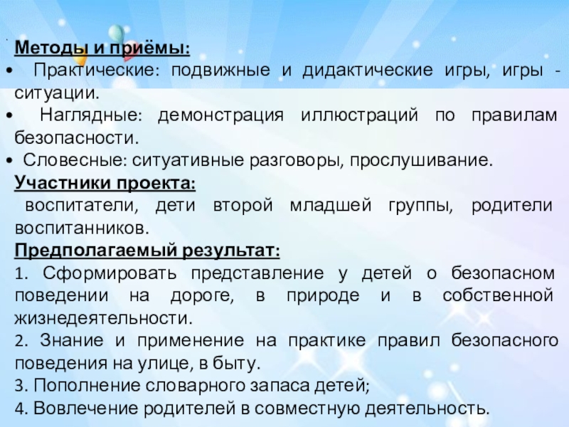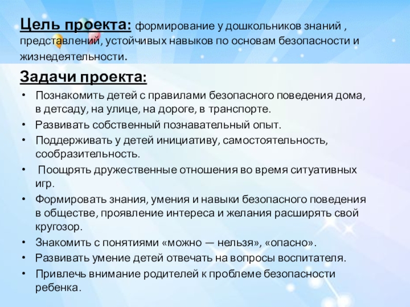 Познакомить детей с правилами безопасного поведения дома, в детсаду, на улице, на дороге, в транспорте.