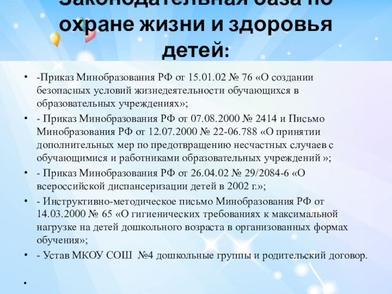 - Приказ Минобразования РФ от 07.08.2000 № 2414 и Письмо Минобразования РФ от 12.07.2000 № 22-06.788 «О принятии дополнительных мер по предотвращению несчастных случаев с обучающимися и работниками образовательных учреждений »;