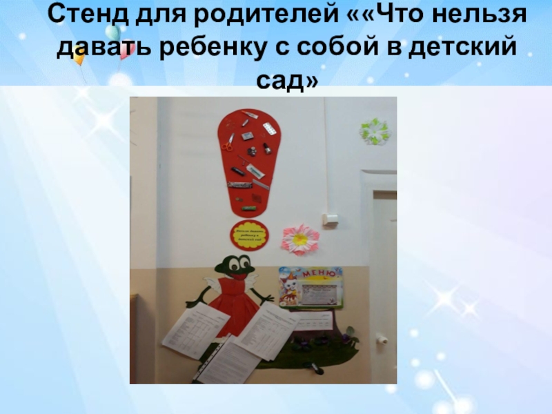 Слайд 48Стенд для родителей ««Что нельзя давать ребенку с собой в детский