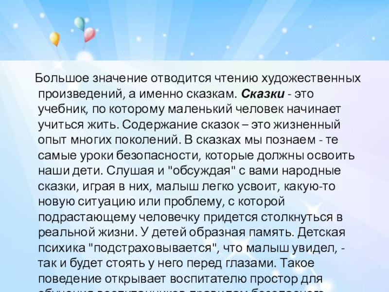Сказки - это учебник, по которому маленький человек начинает учиться жить. Содержание сказок – это жизненный опыт многих поколений. В сказках мы познаем - те самые уроки безопасности, которые должны освоить наши дети. Слушая и "обсуждая" с вами народные сказки, играя в них, малыш легко усвоит, какую-то новую ситуацию или проблему, с которой подрастающему человечку придется столкнуться в реальной жизни. У детей образная память. Детская психика "подстраховывается", что малыш увидел, - так и будет стоять у него перед глазами. Такое поведение открывает воспитателю простор для обучения воспитанников правилам безопасного поведения.