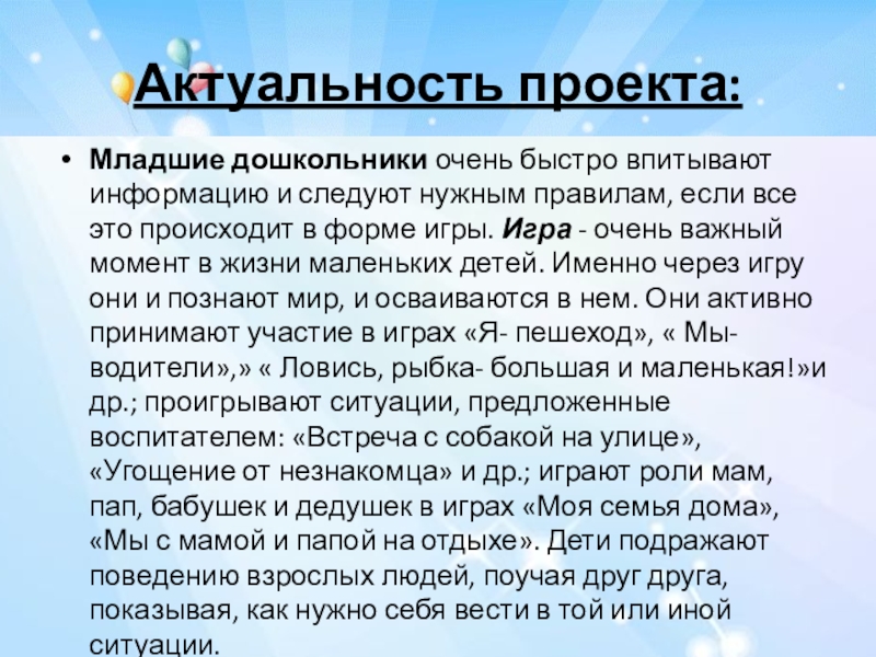 правилам, если все это происходит в форме игры. Игра - очень важный момент в жизни маленьких детей. Именно через игру они и познают мир, и осваиваются в нем. Они активно принимают участие в играх «Я- пешеход», « Мы- водители»,» « Ловись, рыбка- большая и маленькая!»и др.; проигрывают ситуации, предложенные воспитателем: «Встреча с собакой на улице», «Угощение от незнакомца» и др.; играют роли мам, пап, бабушек и дедушек в играх «Моя семья дома», «Мы с мамой и папой на отдыхе». Дети подражают поведению взрослых людей, поучая друг друга, показывая, как нужно себя вести в той или иной ситуации.
