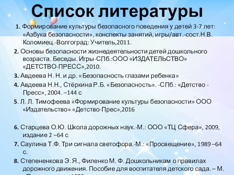 2. Основы безопасности жизнедеятельности детей дошкольного возраста. Беседы. Игры-СПб.:ООО «ИЗДАТЕЛЬСТВО» «ДЕТСТВО-ПРЕСС»,2010.