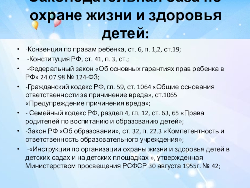 Слайд 4Законодательная база по охране жизни и здоровья детей: