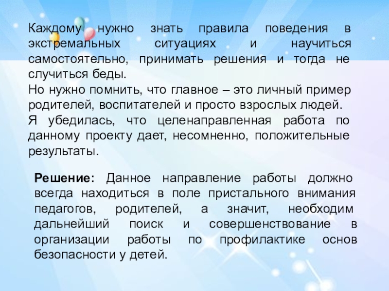 Решение: Данное направление работы должно всегда находиться в поле пристального внимания педагогов, родителей, а значит, необходим дальнейший поиск и совершенствование в организации работы по профилактике основ безопасности у детей.