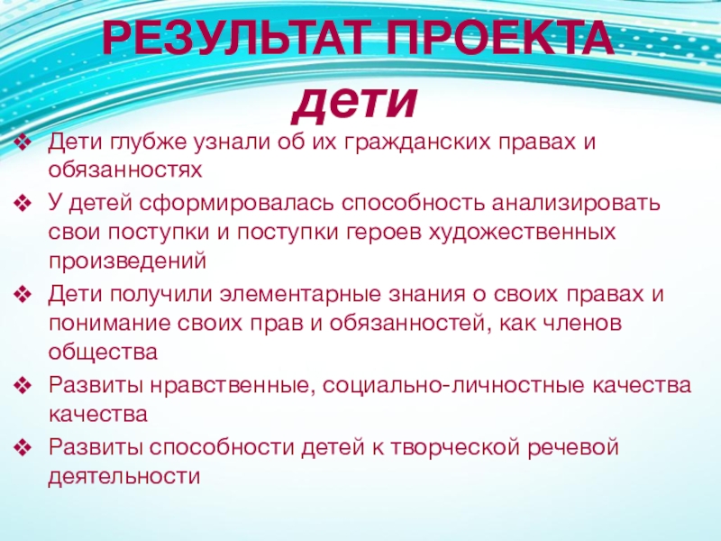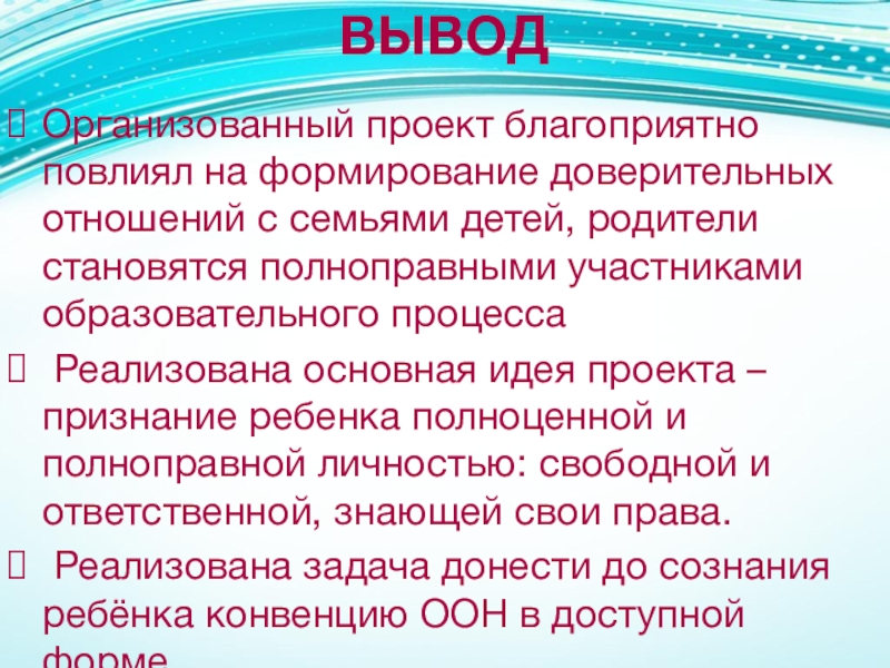 Реализована основная идея проекта – признание ребенка полноценной и полноправной личностью: свободной и ответственной, знающей свои права.