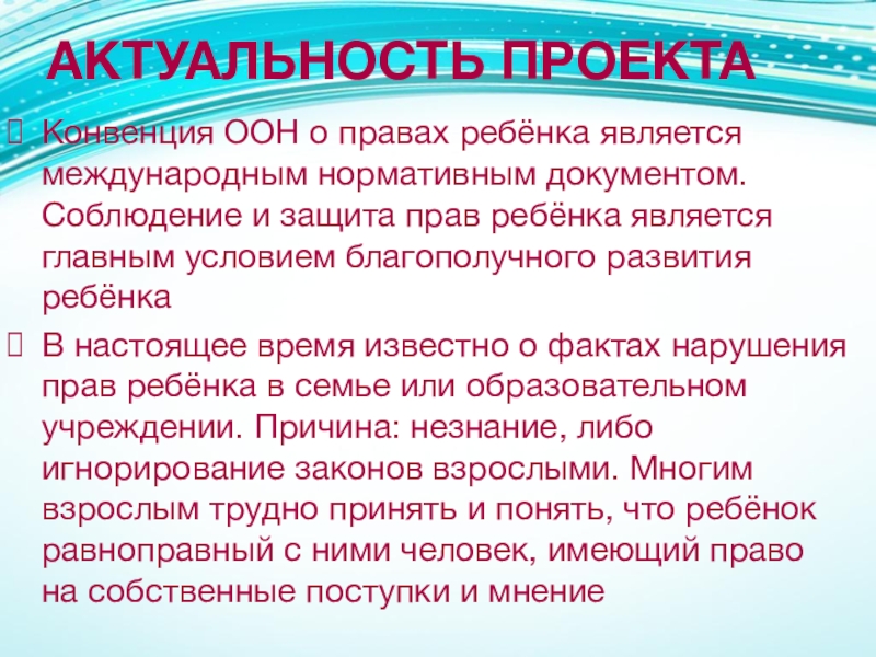 В настоящее время известно о фактах нарушения прав ребёнка в семье или образовательном учреждении. Причина: незнание, либо игнорирование законов взрослыми. Многим взрослым трудно принять и понять, что ребёнок равноправный с ними человек, имеющий право на собственные поступки и мнение