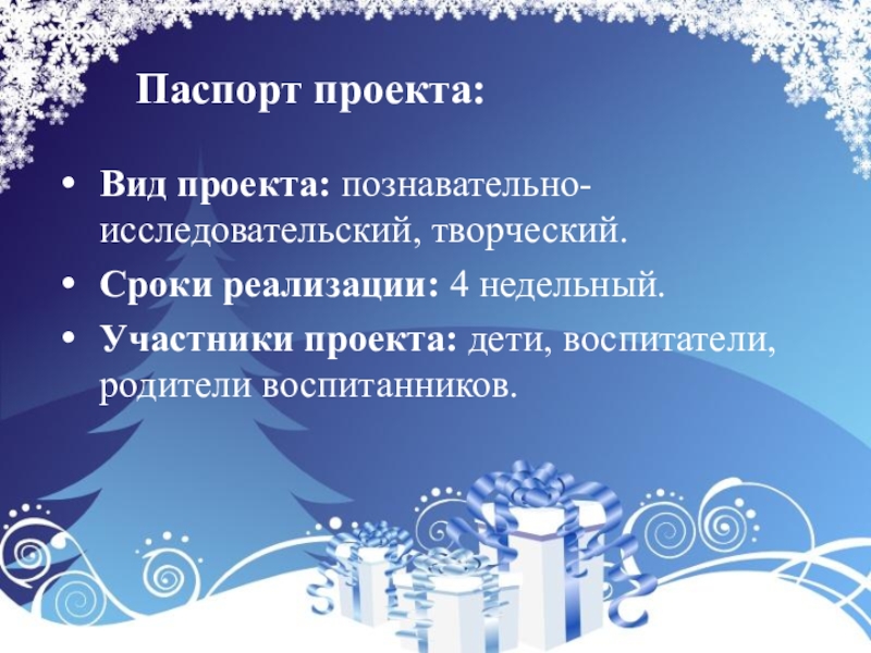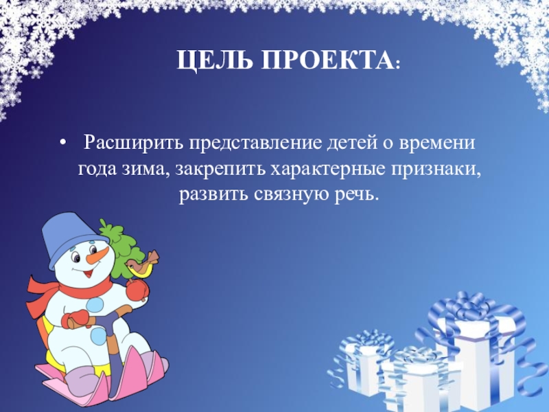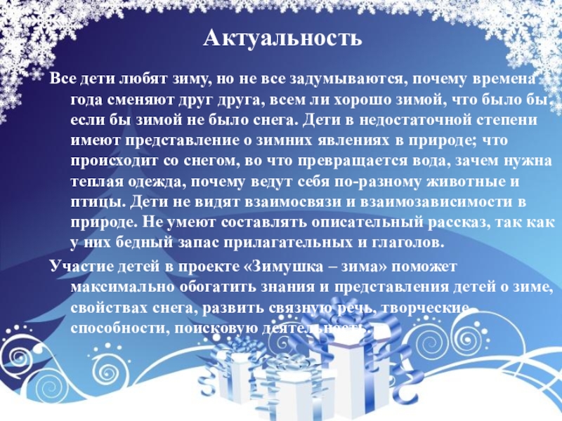 Участие детей в проекте «Зимушка – зима» поможет максимально обогатить знания и представления детей о зиме, свойствах снега, развить связную речь, творческие способности, поисковую деятельность.