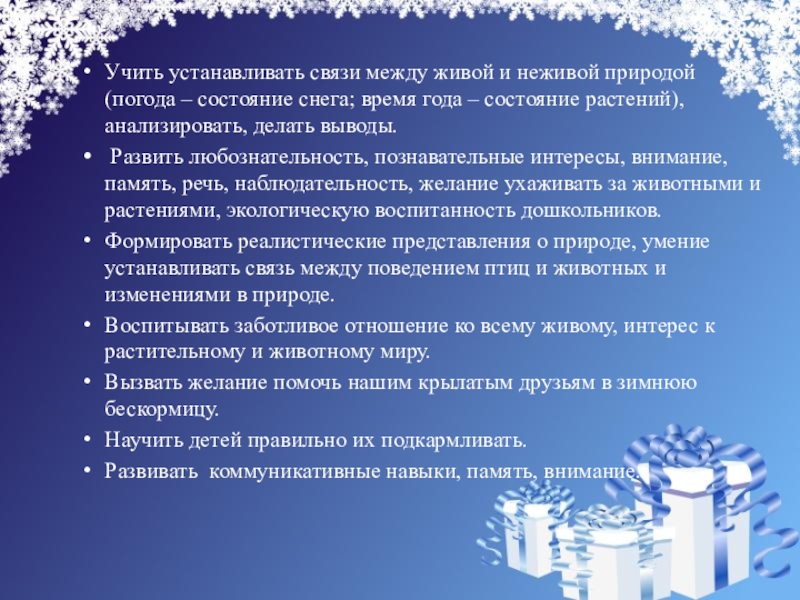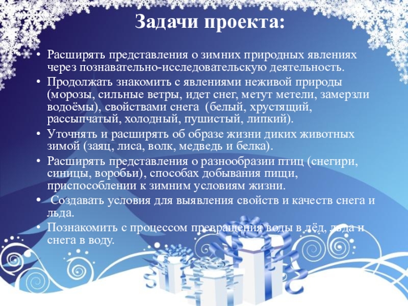 Расширять представления о зимних природных явлениях через познавательно-исследовательскую деятельность.