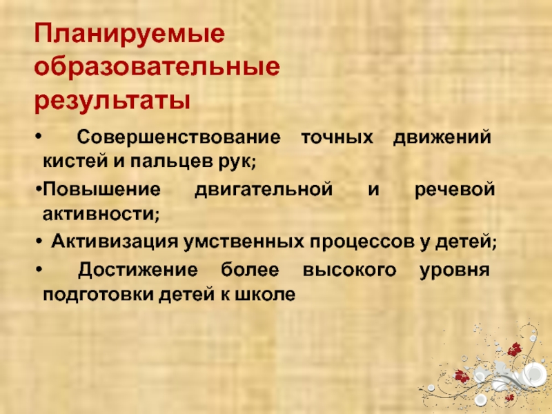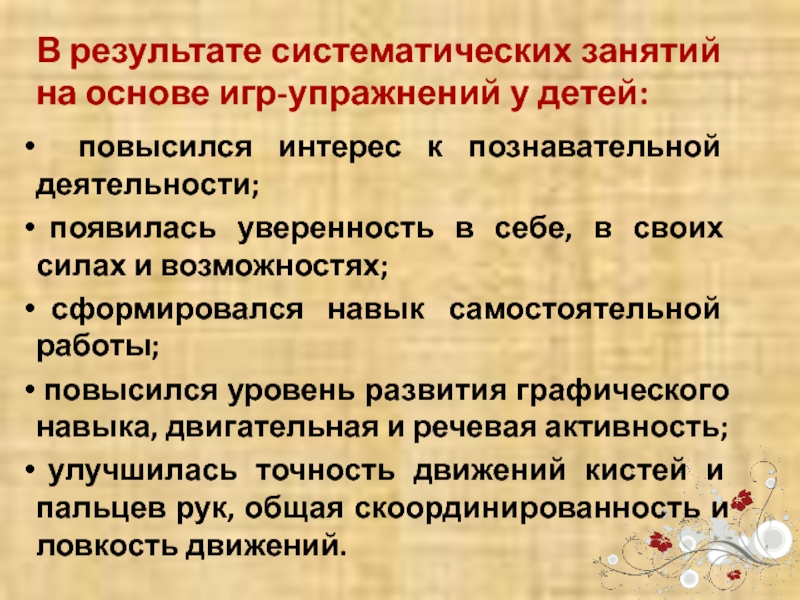 повысился уровень развития графического навыка, двигательная и речевая активность;