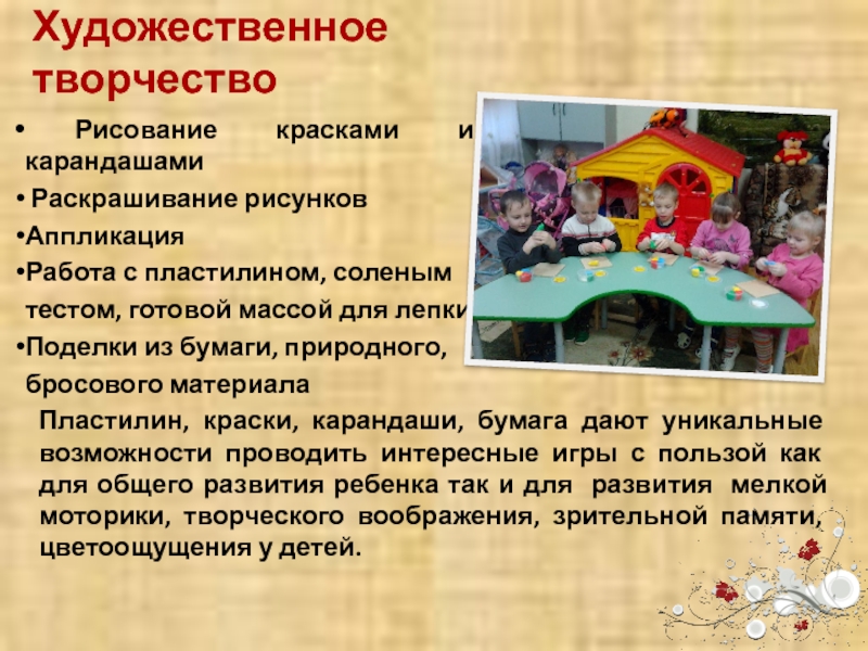Пластилин, краски, карандаши, бумага дают уникальные возможности проводить интересные игры с пользой как для общего развития ребенка так и для развития мелкой моторики, творческого воображения, зрительной памяти, цветоощущения у детей.