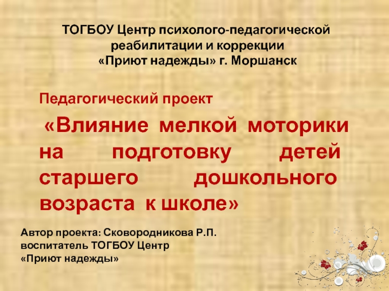 Автор проекта: Сковородникова Р.П. воспитатель ТОГБОУ Центр