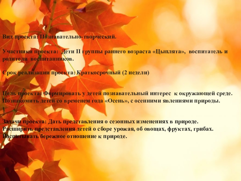 Познакомить детей со временем года «Осень», с осенними явлениями природы.