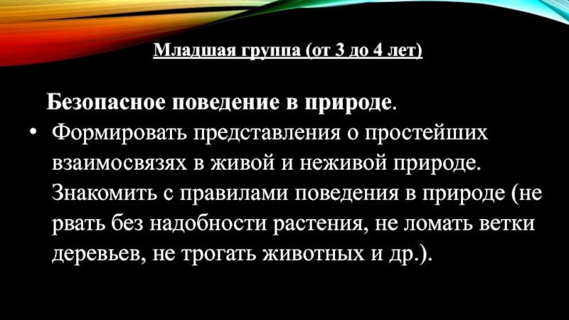 представления о простейших взаимосвязях в живой и неживой природе. Знакомить с правилами поведения в природе (не рвать без надобности растения, не ломать ветки деревьев, не трогать животных и др.).