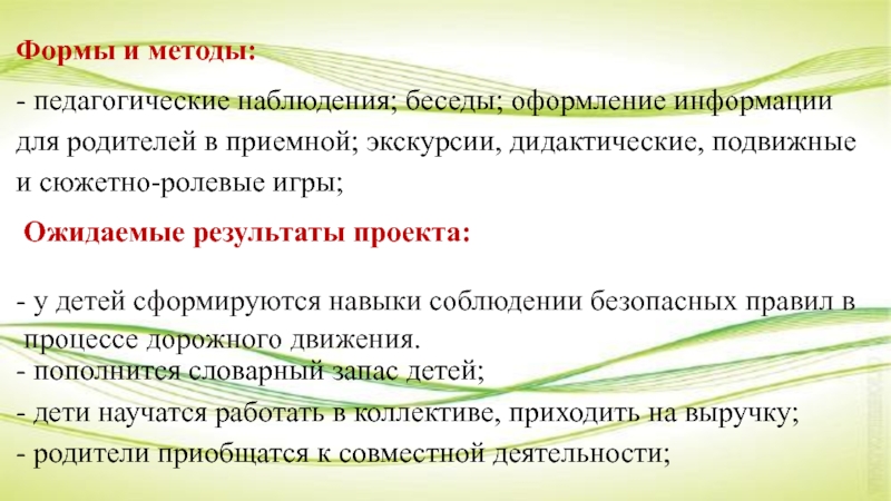 - педагогические наблюдения; беседы; оформление информации для родителей в