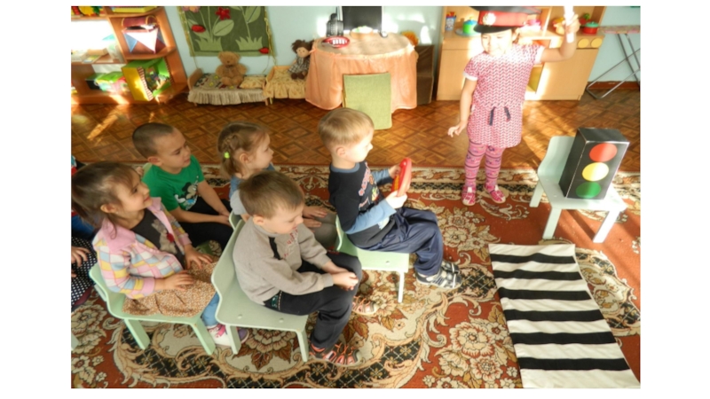 детей об элементах дороги (проезжая часть, пешеходный переход, тротуар), о движении транспорта, о работе светофора.