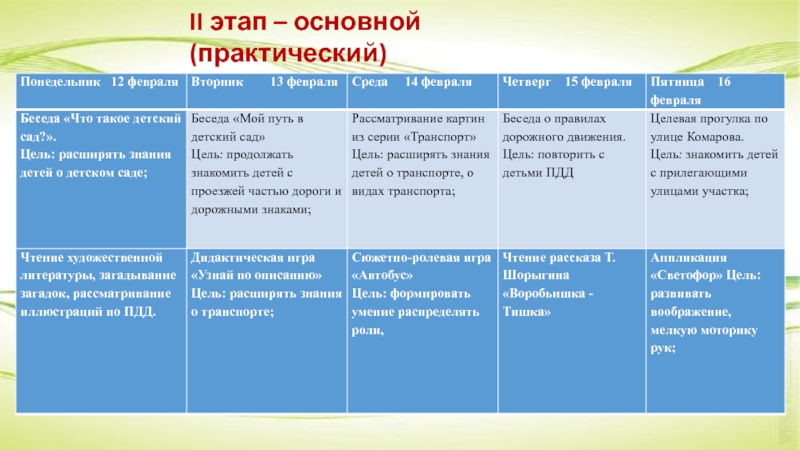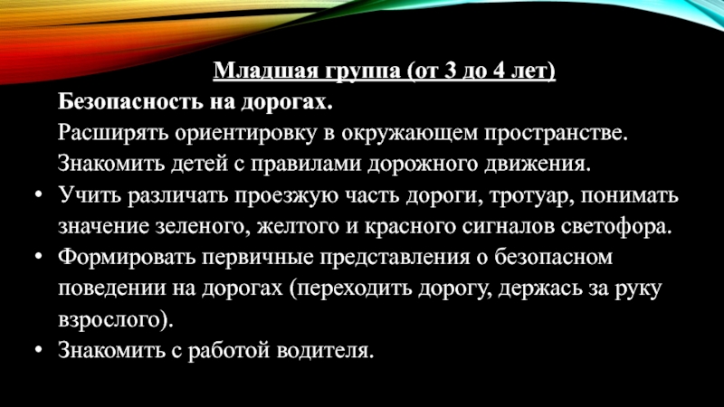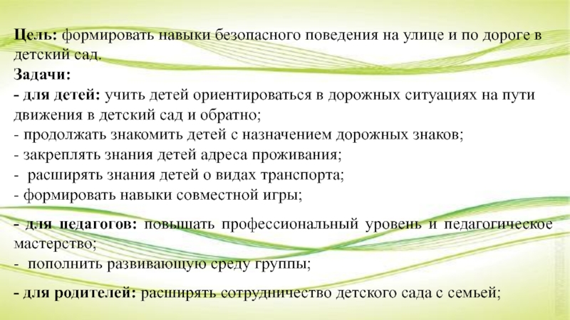 - для детей: учить детей ориентироваться в дорожных ситуациях на пути движения в детский сад и обратно; - продолжать знакомить детей с назначением дорожных знаков;