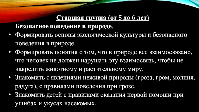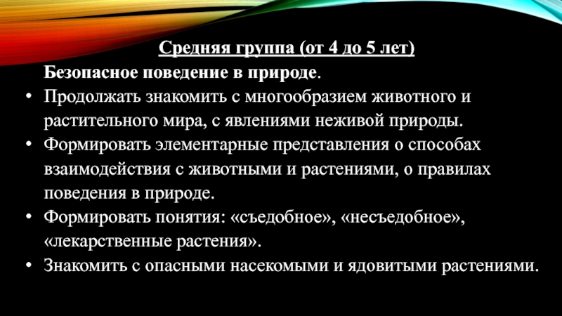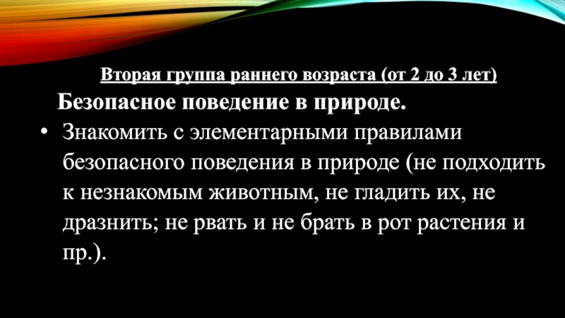 Знакомить с элементарными правилами безопасного поведения в природе (не подходить к незнакомым животным, не гладить их, не дразнить; не рвать и не брать в рот растения и пр.).