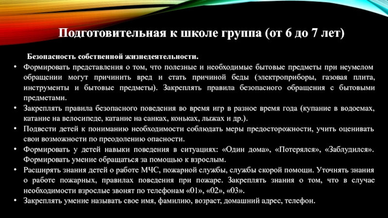 Уточнять знания детей о работе пожарных, о причинах пожаров, об элементарных правилах поведения во время пожара. Знакомить с работой службы спасения — МЧС. Закреплять знания о том, что в случае необходимости взрослые звонят по телефонам «01», «02», «03».