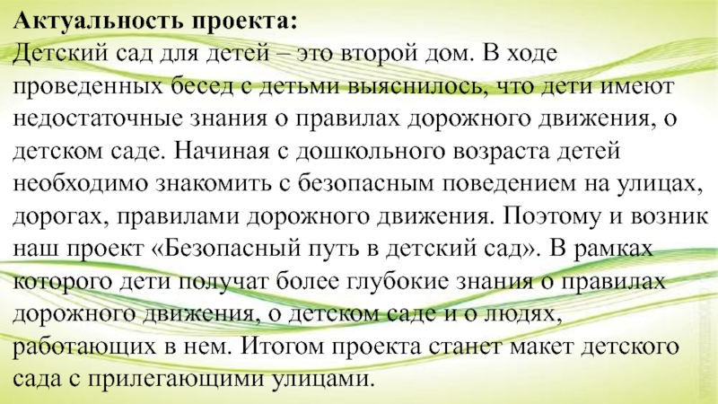 ходе проведенных бесед с детьми выяснилось, что дети имеют недостаточные знания о правилах дорожного движения, о детском саде. Начиная с дошкольного возраста детей необходимо знакомить с безопасным поведением на улицах, дорогах, правилами дорожного движения. Поэтому и возник наш проект «Безопасный путь в детский сад». В рамках которого дети получат более глубокие знания о правилах дорожного движения, о детском саде и о людях, работающих в нем. Итогом проекта станет макет детского сада с прилегающими улицами.