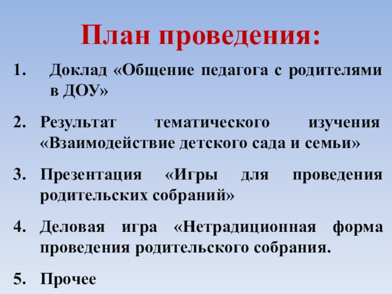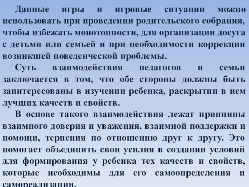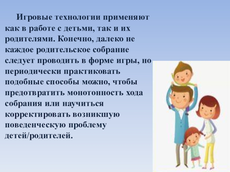 родителями. Конечно, далеко не каждое родительское собрание следует проводить в форме игры, но периодически практиковать подобные способы можно, чтобы предотвратить монотонность хода собрания или научиться корректировать возникшую поведенческую проблему детей/родителей.