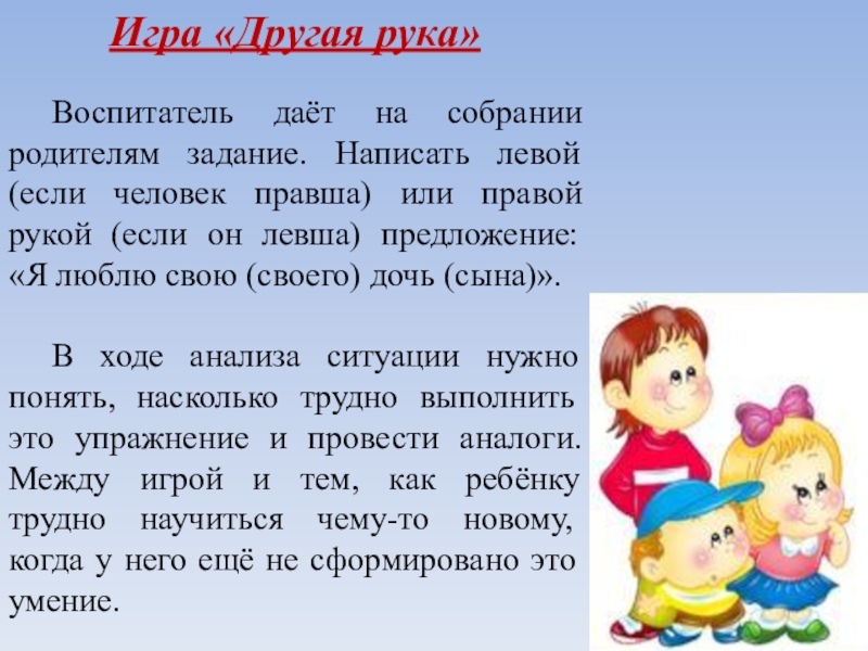 Воспитатель даёт на собрании родителям задание. Написать левой