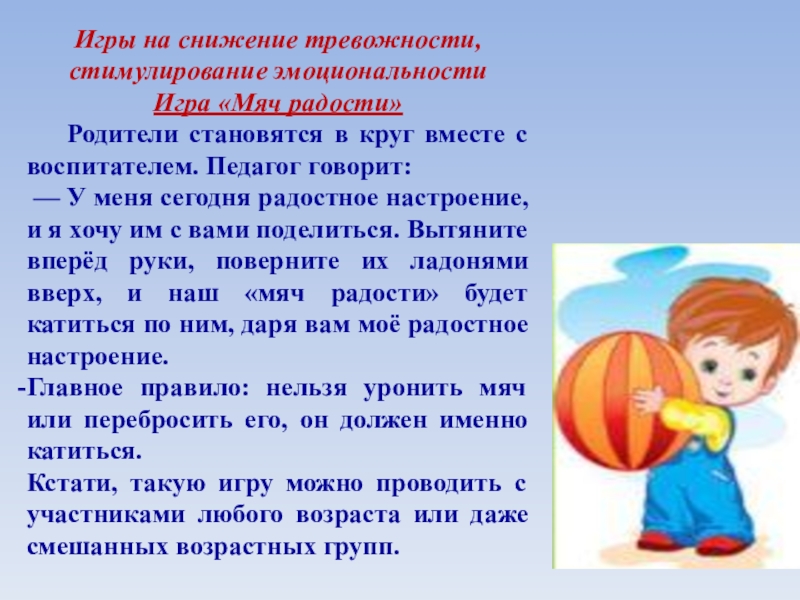 Слайд 13Игры на снижение тревожности, стимулирование эмоциональности