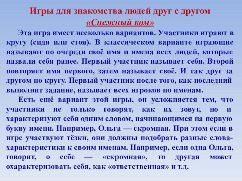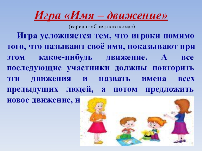 игроки помимо того, что называют своё имя, показывают при этом какое-нибудь движение. А все последующие участники должны повторить эти движения и назвать имена всех предыдущих людей, а потом предложить новое движение, назвав себя.