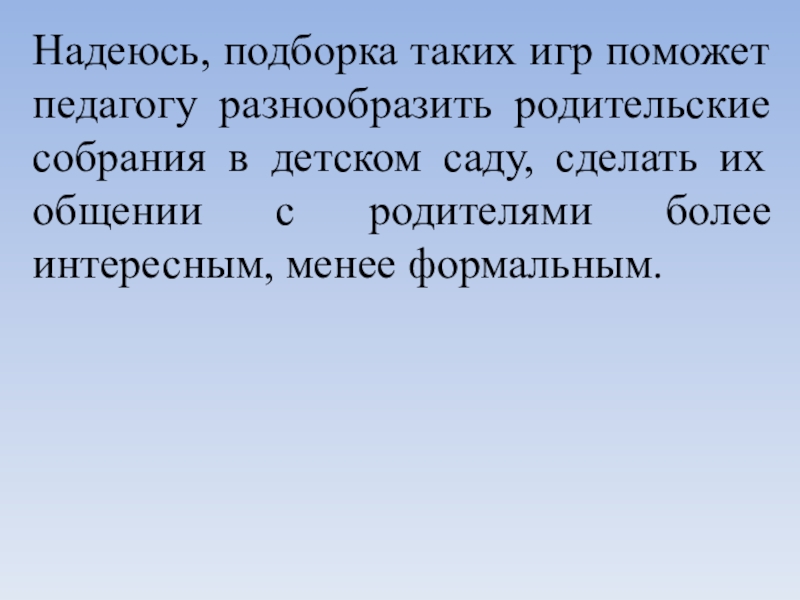 Слайд 16Надеюсь, подборка таких игр поможет педагогу разнообразить родительские собрания в детском