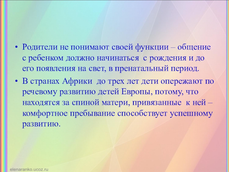 В странах Африки до трех лет дети опережают по речевому развитию детей Европы, потому, что находятся за спиной матери, привязанные к ней – комфортное пребывание способствует успешному развитию.
