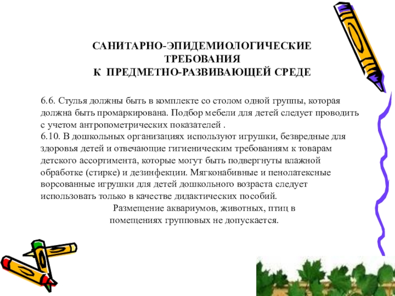 6.10. В дошкольных организациях используют игрушки, безвредные для здоровья детей и отвечающие гигиеническим требованиям к товарам детского ассортимента, которые могут быть подвергнуты влажной обработке (стирке) и дезинфекции. Мягконабивные и пенолатексные ворсованные игрушки для детей дошкольного возраста следует использовать только в качестве дидактических пособий.