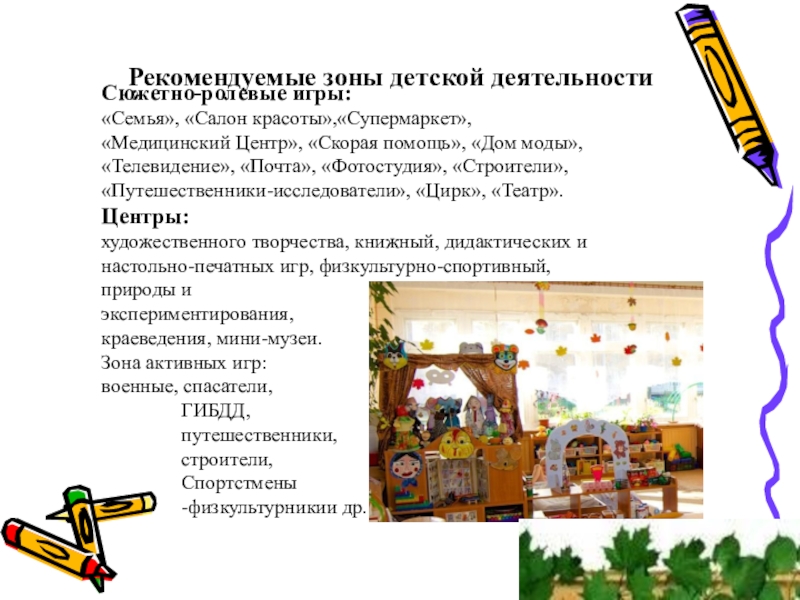 •Наличие разнообразных центров развития (экспериментирования, художественного творчества и т.д.).