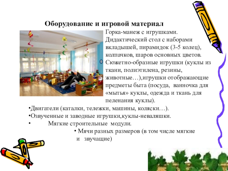 •сочетание реалистичных игрушек и игрушек-заместителей, способствующих развитию творчества, воображения и познания.