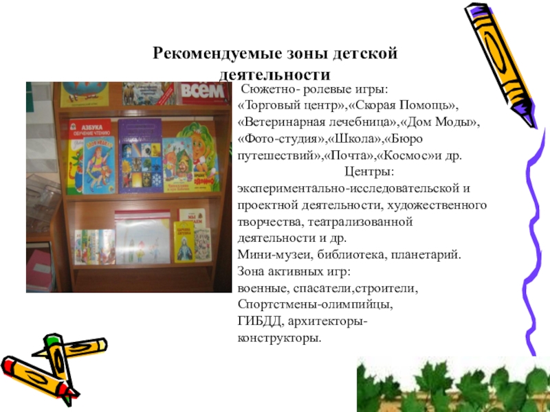 художественного творчества, книжный, дидактических и настольно-печатных игр, физкультурно-спортивный,