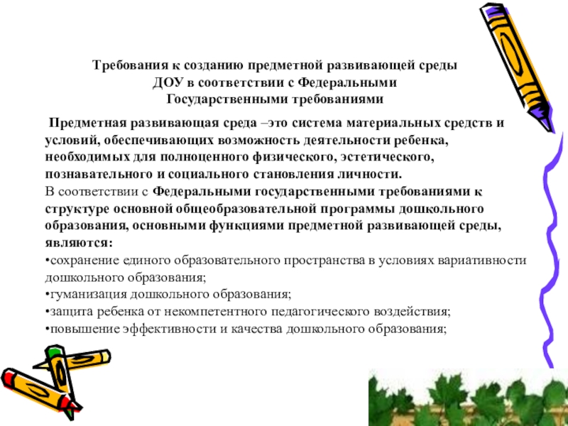 Слайд 2Требования к созданию предметной развивающей среды ДОУ в соответствии с Федеральными
