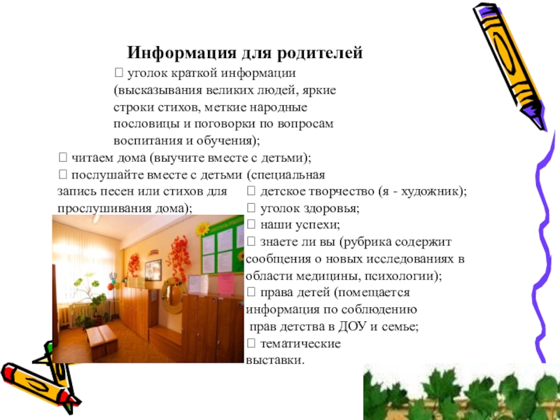 книжный, изобразительного творчества, музыкальный, дидактических игр, физкультурный, природы и экспериментирования, дежурства по столовой.