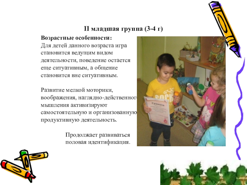 игровой деятельности; структурированием игрового пространства, дальнейшим развитием изобразительной деятельности, отличающейся высокой продуктивностью.