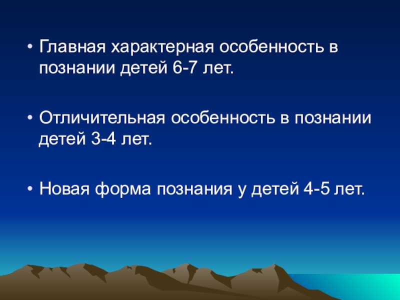 Главная характерная особенность в познании детей 6-7 лет. Отличительная особенность в познании детей 3-4 лет.Новая форма познания