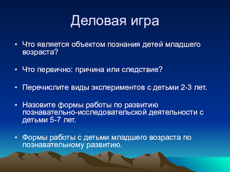 Деловая игра Что является объектом познания детей младшего возраста?Что первично: причина или следствие? Перечислите виды экспериментов с детьми 2-3 лет.Назовите формы работы по развитию познавательно-исследовательской деятельности с детьми 5-7 лет.Формы работы с детьми младшего возраста по