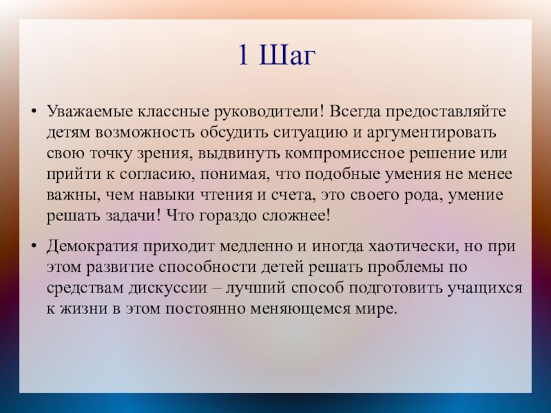 Демократия приходит медленно и иногда хаотически, но при этом развитие способности детей решать проблемы по средствам дискуссии – лучший способ подготовить учащихся к жизни в этом постоянно меняющемся мире.