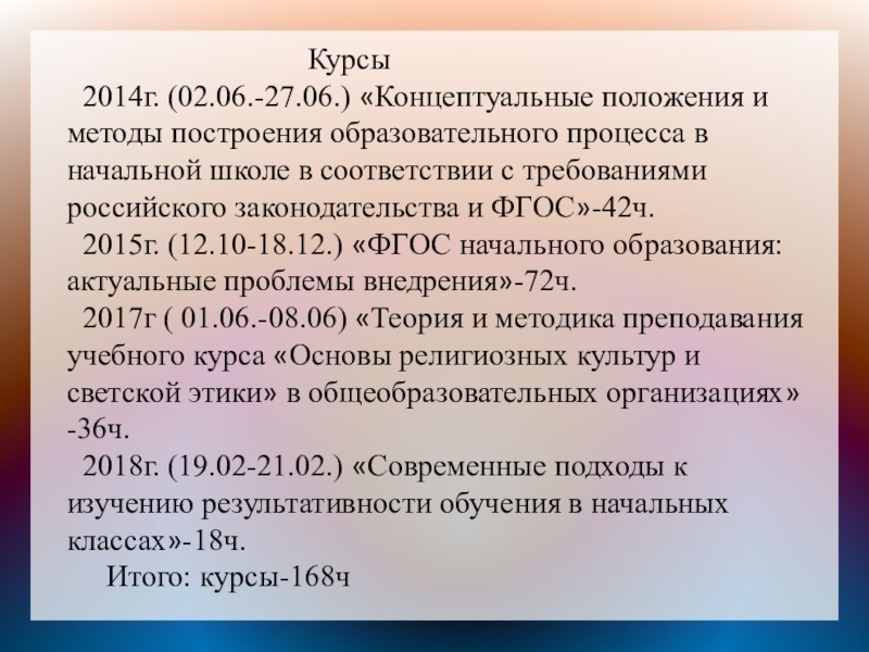 2014г. (02.06.-27.06.) «Концептуальные положения и методы построения образовательного процесса в начальной школе в соответствии с требованиями российского законодательства и ФГОС»-42ч.