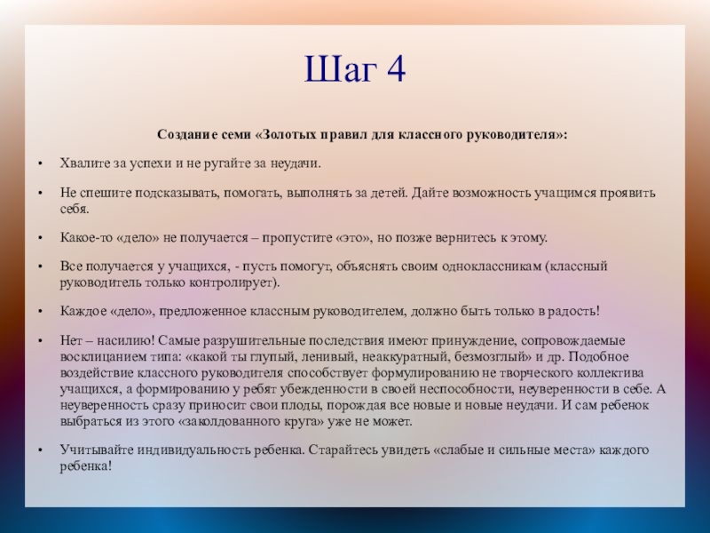 Создание семи «Золотых правил для классного руководителя»: