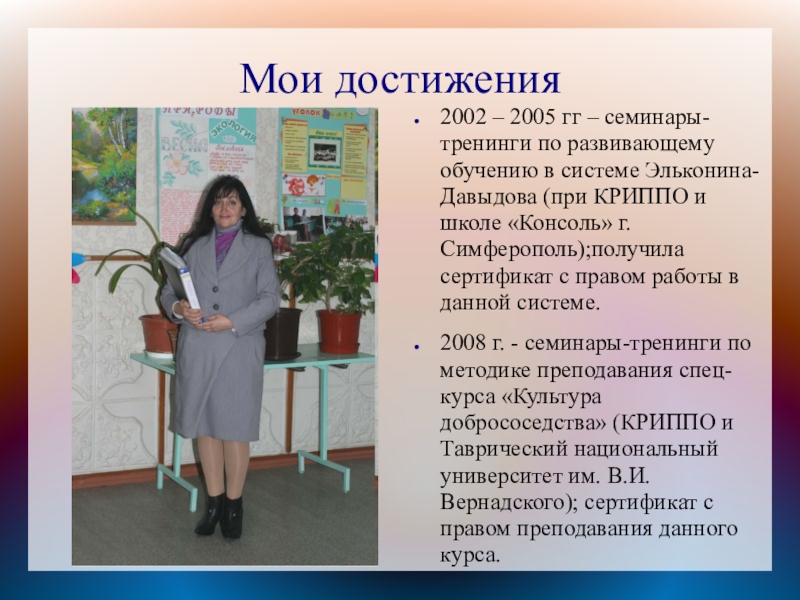 системе Эльконина-Давыдова (при КРИППО и школе «Консоль» г. Симферополь);получила сертификат с правом работы в данной системе.